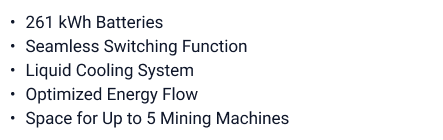 - 261 kWh Lithium Iron Phosphate (LiFePO₄) batteries;