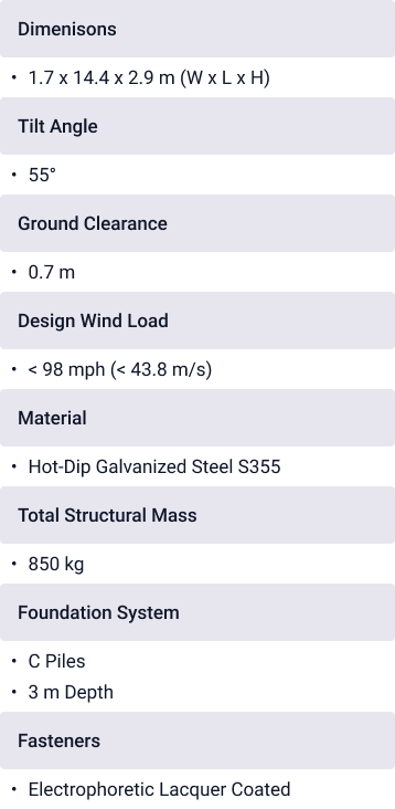 Structural stability is ensured through precisely engineered ballast weight combined with a robust steel frame and cross-bracing system. The design is optimized to withstand wind and snow loads while maintaining long-term reliability and performance.