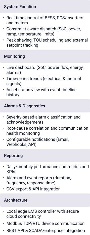 real-time optimization, safe battery dispatch, and full system visibility for BESS installations.